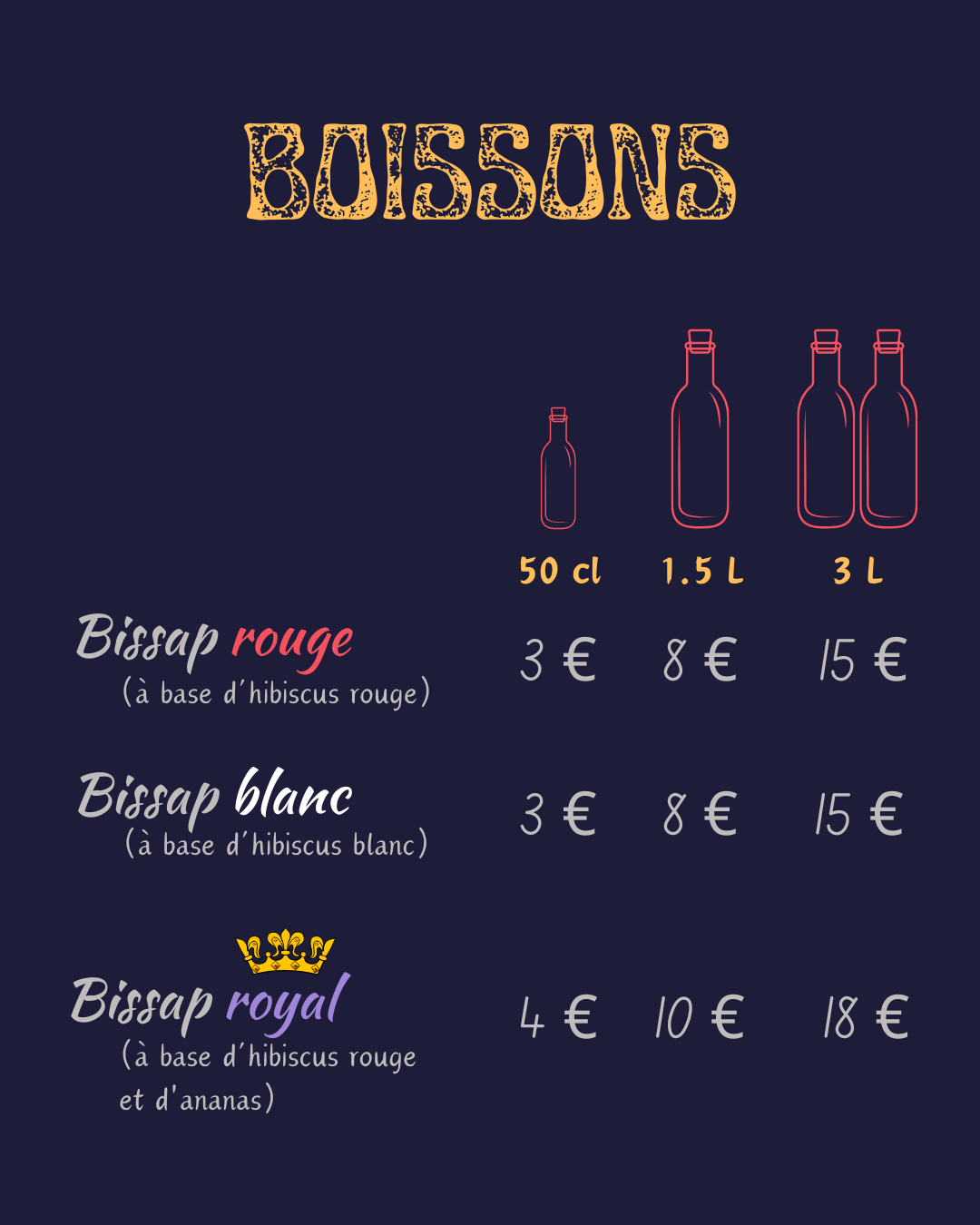 Nous vous proposons une gamme de boissons non alcoolisées qui marient des ingrédients frais et des recettes uniques. Rouge, blanc ou royal, choisissez le bissap qui fera voyager vos papilles tout en vous rafraîchissant.